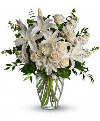 The Dreams From the Heart Bouquet is a stunning way to express your sorrow and condolences to a bereaved family. This exquisite arrangement features white hydrangeas, creme roses, white oriental lilies, white spray roses, spiral eucalyptus, white stock, Italian ruscus, and salal. The timeless glass vase ensures that the flowers remain fresh for an extended period.