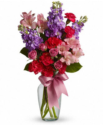 If you're looking for the perfect gift to resolve a fight with a loved one or to lift up a friend who is going through a tough time, Jumping for Joy is the answer. This bouquet is overflowing with the season's best picks of flowers, including ethereal pink spray roses, light pink alstroemeria, slender lavender stocks, and alluring hot pink carnations, all symbolizing love, friendship, honor, and respect.